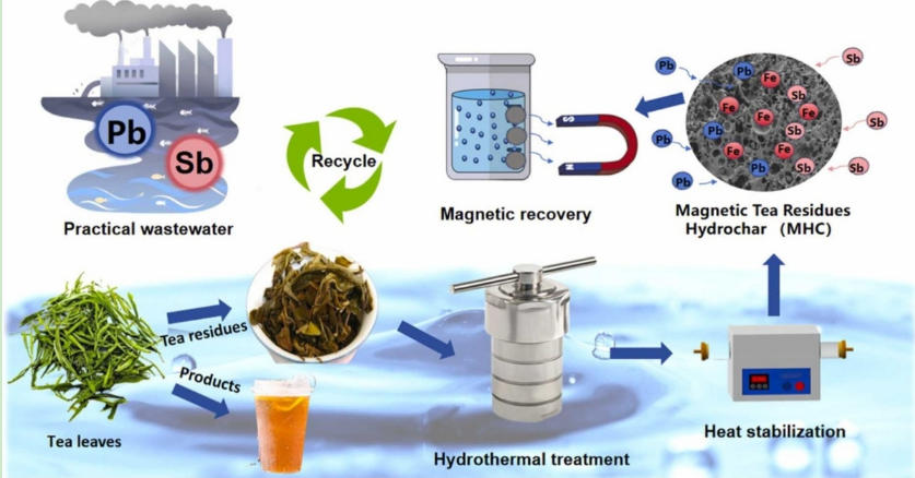 玉尖凤同学以第一作者身份在国际权威期刊《Industrial Crops & Products(中国科学院一区)上发表了题为Lead and antimony removal from wastewater via tea residue derived hydrochar: Immobilization capacity and industrial practicality的论文。该论文针对采矿废水中铅锑共存污染问题,创新性地利用废弃茶渣制备磁性水热炭,实现了对PbIISbⅢ)的高效同步去除,其吸附容量分别达328.2411.1 mg/g-1,并通过柱实验与实际废水验证了其工程应用潜力,为重金属废水治理与农业废弃物资源化提供了可行路径。能环学院本科生玉尖凤为论文共同第一作者,王华斌副教授和向泰副教授为通讯作者。此外,玉尖凤同学在《Separation and Purification Technology(中国科学院二区)上发表了题为Co-immobilization of organic and inorganic pollutants via functional magnetic hydrochar derived from potato straw: Mechanisms insight and practicality assessment的论文。该论文针对工业废水中常共存的有机染料亚甲基蓝MB与无机重金属汞HgII因性质差异难以协同去除的问题,创新性地利用马铃薯秸秆通过水热法制备了功能性磁性水热炭材料(MHC),实现了对MBHgII的高效协同固定,为农业废弃物高值化利用及有机无机复合污染治理提供了可行路径与技术支撑。能环学院本科生玉尖凤为论文共同第一作者,王华斌副教授和徐锐教授为通讯作者。