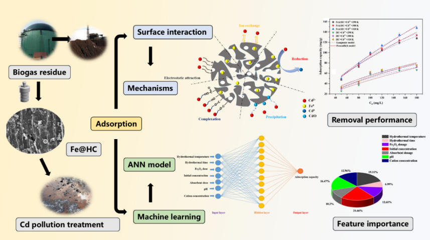 程慧同学以共同第一作者身份在国际权威期刊《Results in Engineering(中国科学院二区)上发表了题为Efficient removal of cadmium by zero-valent iron-coated hydrochar derived from biogas residues: Surface interaction and machine learning interpretation的论文。该论文针对沼气残渣资源化利用与重金属污染治理的双重需求,创新性地提出以猪粪沼气残渣为碳源制备零价铁改性水热炭材料(Fe@HC),实现了对废水中镉的高效去除。该研究为废弃生物质资源化与重金属污染控制提供了一条可持续、智能化的技术路径。此外,程慧同学以第一作者身份在国际权威期刊《Results in Engineering(中国科学院二区)上发表了题为Hydrothermal extraction of chlorogenic acid from tobacco waste facilitated by Fe catalyst and optimization of process parameters的论文。该论文针对烟草废弃物中绿原酸传统提取方法效率低、存在有机溶剂二次污染的问题,创新性地提出了一种铁催化辅助水热提取方法(Fe-HTE),并结合人工神经网络(Artificial Neural Network, ANN)与响应面法(Response Surface Methodology, RSM)对工艺参数进行系统优化,实现了绿原酸的高效、绿色提取。该方法在温和条件下显著提高了提取效率(达20.31 mg/g),避免了有机溶剂的使用,为农业废弃物的高值化资源回收提供了一条清洁、可控且具有潜力的工程化路径。能环学院本科生程慧为论文第一作者,王华斌副教授和徐锐教授为通讯作者。