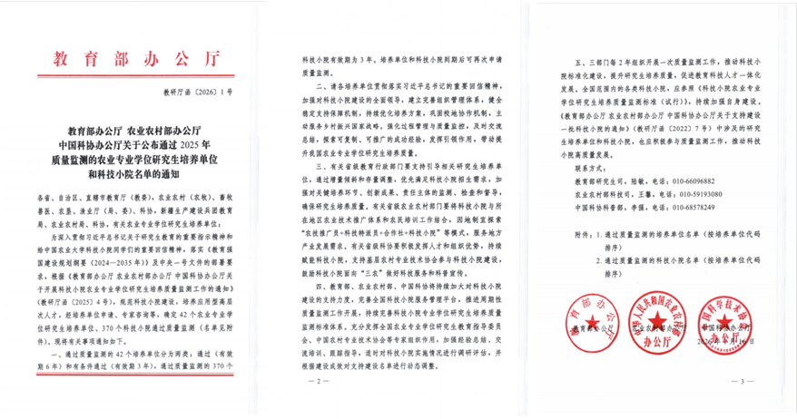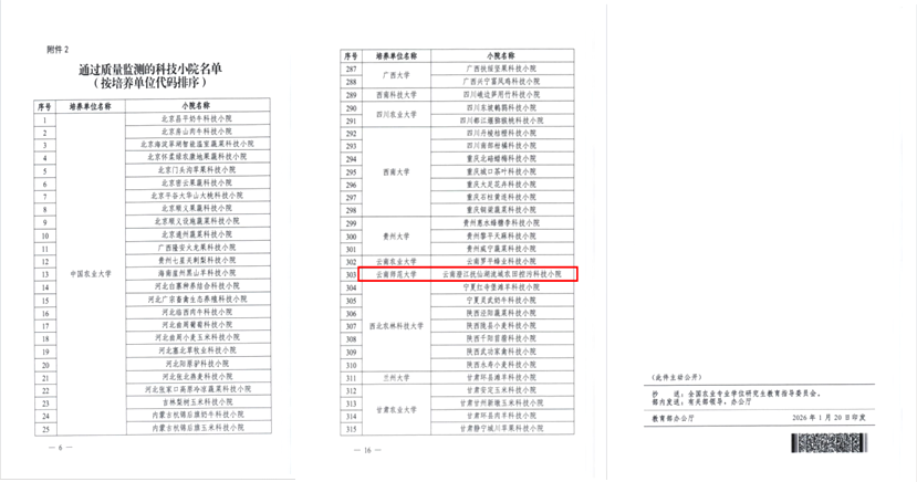 近日,教育部、农业农村部、中国科协三部委联合发布《关于公布通过2025年质量监测的农业专业学位研究生培养单位和科技小院名单的通知》(教研厅函〔2026〕1号),云南师范大学牵头建设的云南澄江抚仙湖流域农田控污科技小院(即:省级“云南澄江抚仙湖流域保护科技小院”)成功入选。此次入选标志着该小院在农业专业学位研究生实践培养、科技助力生态环境保护与乡村振兴融合发展等方面的工作获得国家级权威认可,为学校研究生教育高质量发展注入新动能。