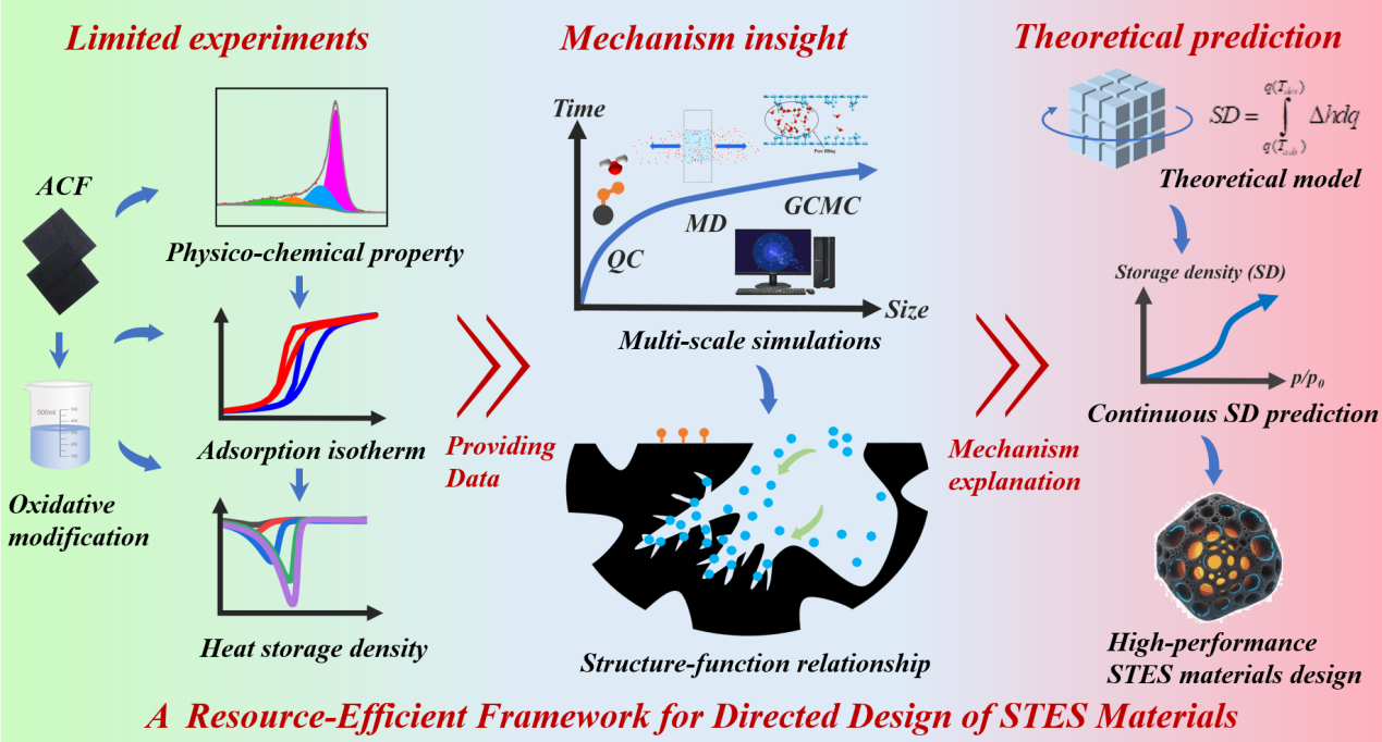 吸附储热技术因其环境友好性和可实现跨时域存储优势,已成为极具发展前景的储能方式。然而,活性炭–水蒸气工质对在低湿度条件下储热密度偏低,制约了其在多气候条件下的高效应用。为此,团队创新性地提出以“少量实验–多尺度模拟–理论预测”相结合的自上而下设计策略,通过有限实验数据验证与多尺度建模相结合,实现了高储热性能氧化活性炭纤维的理性设计,克服了传统试错方法资源消耗大、成本高的问题。研究表明,经氧化改性引入羟基和羧基等亲水基团的协同作用,活性炭纤维水蒸气吸附储热密度较原样提高了78%。进一步地,基于Dubinin–Polanyi吸附理论与团队前期构建的Do–Do有限简化模型,建立了适用于全湿度范围的储热密度预测模型,为高性能吸附储热材料的快速优化设计提供了框架体系,并且可推广至空气取水与除湿等相关领域。该项研究成果于2025年10月13日发表在《ACS Sustainable Chemistry & Engineering》期刊(一区,IF=7.3)上,全文链接:https://doi.org/10.1021/acssuschemeng.5c07311,硕士研究生莫忠凡为第一作者,余琼粉教授为通讯作者,研究工作图形摘要如下所示。