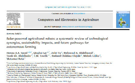 近期,国际知名期刊《Computers and Electronics in Agriculture》在线发表了云南师范大学能源与环境科学学院赖庆辉教授团队在智慧农业与新能源交叉领域取得的综述性研究成果,论文题目为《Solar-powered agricultural robots: a systematic review of technological synergies, sustainability impacts, and future pathways for autonomous farming》(中国科学院一区TOP,农林科学/计算机跨学科领域权威期刊,影响因子IF为8.9)。我院 Hassan A.A. Sayed 博士后为论文的第一作者,赖庆辉教授为论文的通讯作者。论文得到了云南师范大学、Al-Azhar University、Fayoum University等单位的指导与支持。