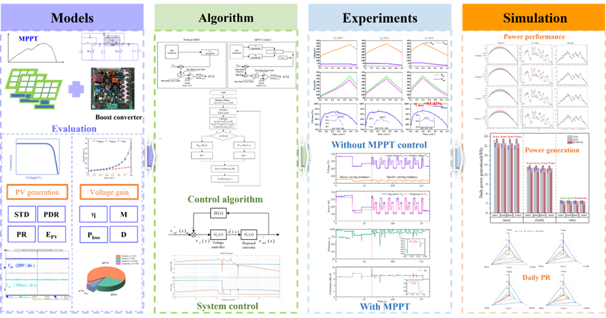 针对光伏组件长期运行后性能非均匀衰减导致的电特性失配痛点,该团队设计改进型二次型升压变换器并研制550W组件级样机。实验表明,该变换器可使失配组件在不同辐照条件下日发电量提升0.40%-9.59%。相关成果以“Topology Design of Quadratic Boost Converter for Nonuniformly Aged Photovoltaic Modules Mismatch Mitigation”为题,2026年2月5日在线发表于Solar Energy期刊(中科院二区,IF=6.6),硕士研究生高丰、张国超为论文共同第一作者,马逊教授为通讯作者。