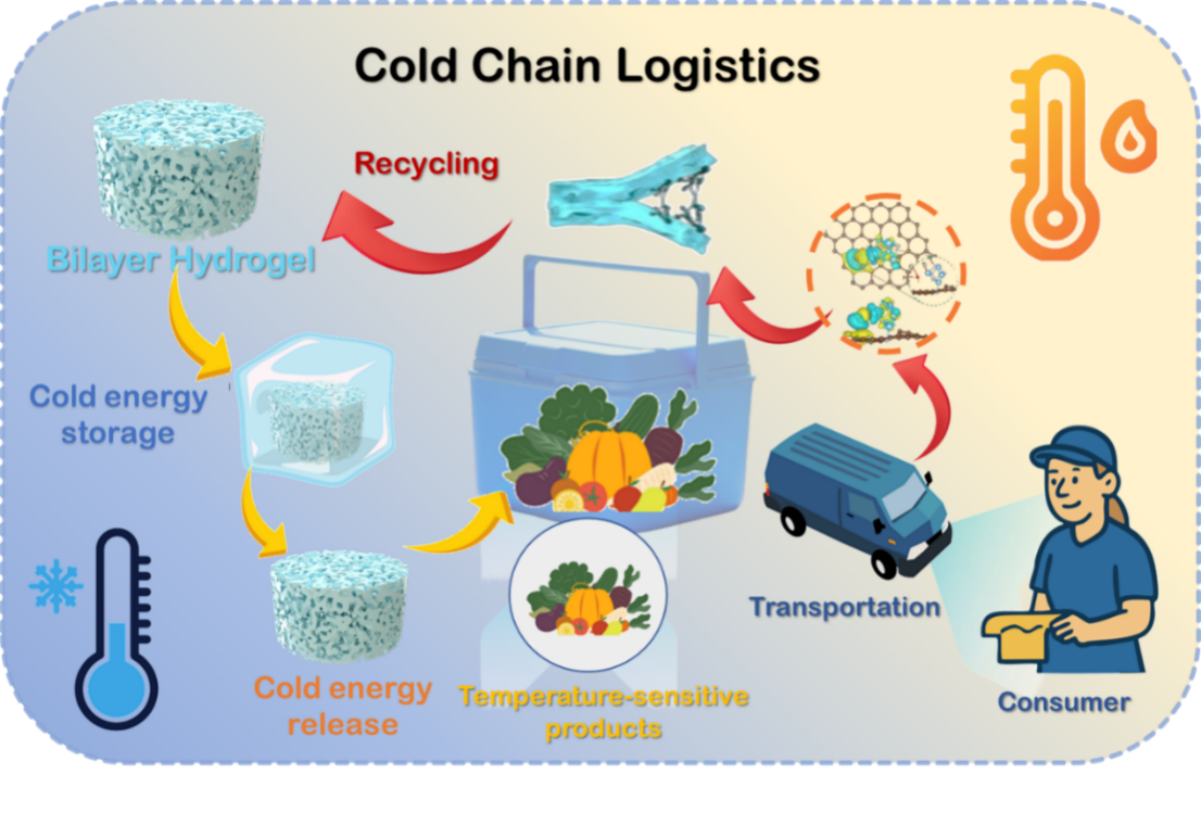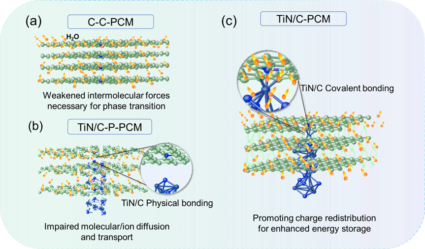 在气凝胶复合水基相变材料制备方面,本课题组提出了界面电子结构工程策略,成功制备了TiN/C气凝胶复合水基相变材料。文章以Ti3C2Tx MXene/纤维素气凝胶为前驱体,经高温热解实现TiN纳米晶在多孔碳骨架中的原位锚定,构建具有强相互作用的TiN/C共价异质界面。该界面形成的TiN—C共价键具有化学稳定性与界面电子活性,通过诱导电荷重新分布,显著增强水分子极化与界面化学吸附作用,有效稳定相变过程中的水分子氢键网络,从而降低水基相变材料的潜热损失。实验结果表明,复合相变材料在添加剂(TiN/C-3)添加量为7.1 wt%时相变潜热为268.83 J g-1,潜热保留率达97.92%,过冷度仅为0.09℃。冷链模拟应用测试表明,该材料可将保温箱内温度稳定控制在冷链物流0−4℃区间超7小时,能够满足食品保鲜、医药冷链运输等场景的温控要求。该研究成果于2026年3月18日以《Interface electronic-structure engineered TiN/C aerogel composites for latent heat enhancement in water-based phase change materials toward efficient cold energy storage》为题发表在《Composites Part B: Engineering》(一区TOP期刊,IF=14.2)上,全文链接:https://www. sciencedirect.com/science/article/pii/S1359836826002428,学院博士研究生孙爱月为第一作者,张莹博士、李明教授为共同通讯作者。研究工作得到云南省西南联合研究生院科技专项重大项目课题(202502AO070004)资助、云南省兴滇人才-青年人才项目资助。