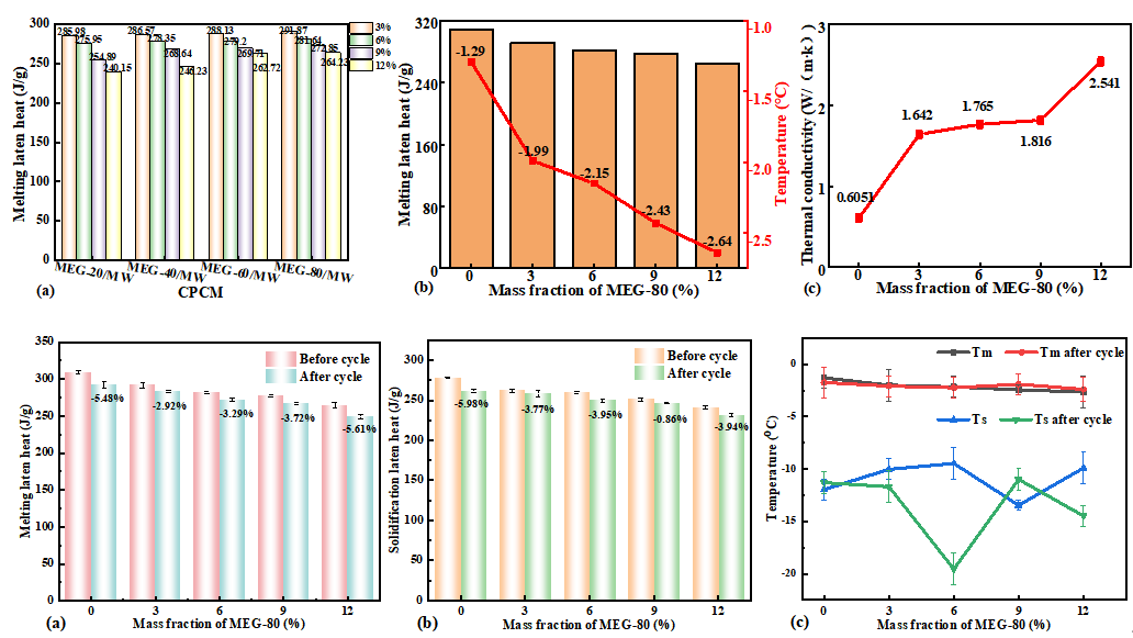 在低碳能源体系转型加速推进与冷链物流产业快速发展的背景下,开发高效、稳定、可持续的冷能存储材料已成为重要研究方向。水基相变材料因潜热密度高、成本低廉、环境友好等优势,被视为冷能存储领域的理想候选体系。但其固有热导率低、过冷度大、循环稳定性差等关键问题,严重制约了其实际应用。为解决上述瓶颈,现有研究多通过引入功能添加剂进行改性,然而添加剂引入会破坏水分子氢键网络,导致材料潜热损失。为实现兼具高潜热密度、热导率和低过冷度材料的研发,高原特色农业太阳能多元化利用创新团队负责人李明教授指导团队成员张莹博士和研究生们共同开展了气凝胶基、碳基复合水基相变材料以及相变微胶囊技术的系列深入研究,近期在该领域连续发表三篇高水平学术论文。