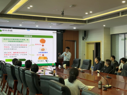 陈玉保对帅李的到来表示热烈欢迎,并介绍了学院发展历程、学院学科建设、人才培养及科研创新等方面取得的成果。帅李系统阐述了生物质催化转化领域的最新研究进展,包括其团队近年来在Nature、Science、Science Advances等国际顶级期刊上发表的重要研究成果,为在场师生带来了一场学术盛宴。他分享了自己在美国威斯康星大学麦迪逊分校的博士研究,以及在瑞士洛桑联邦理工大学、美国特拉华大学的博士后研究工作经历,深入浅出地介绍了化学保护策略在生物质高值化利用中的创新性研究内容及产业应用。